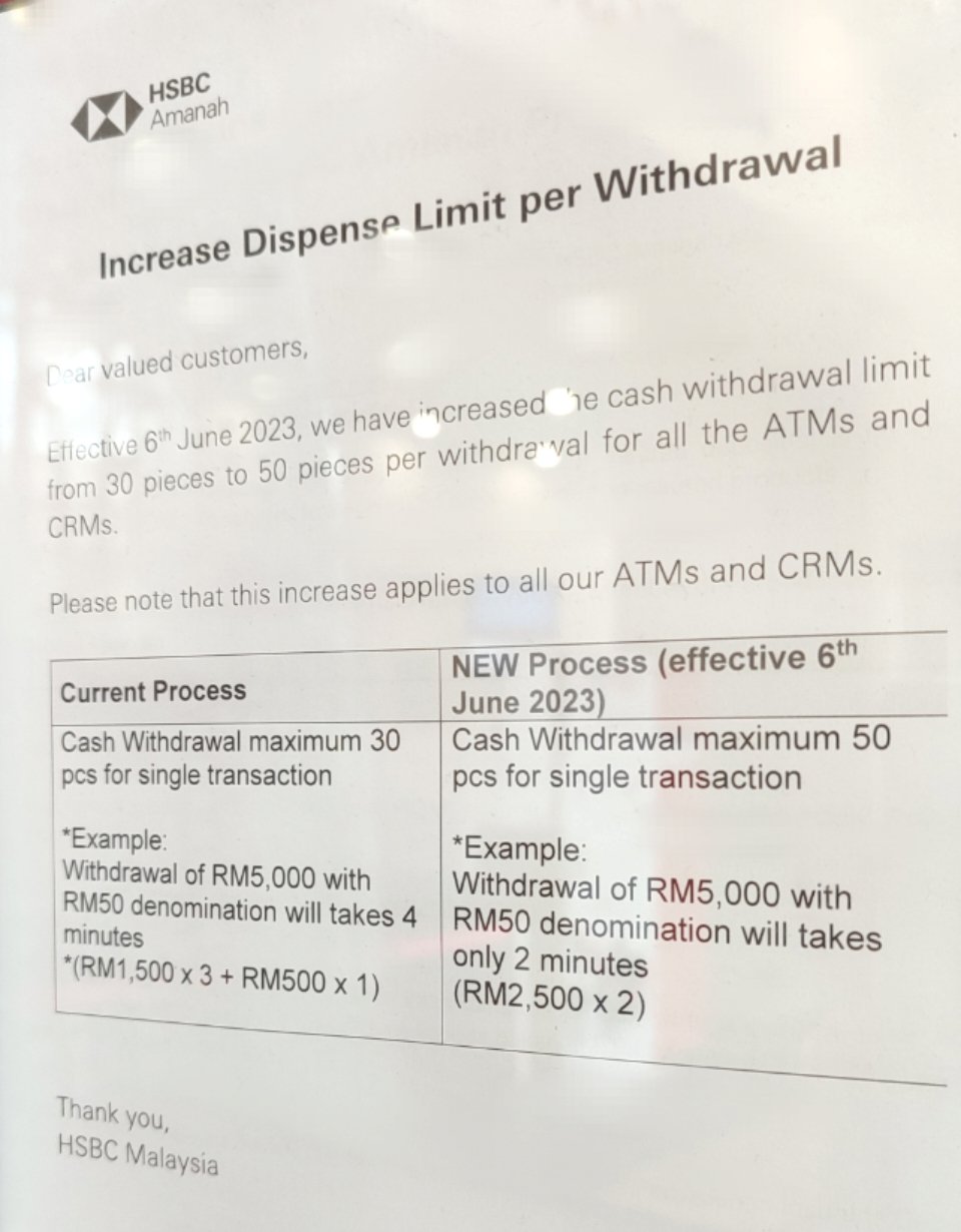 1日にATMから出金できる限度額はRM5,000。また以下のX(旧Twitter)にポストした通り、2023年6月から1回あたりのATM引き出し上限額がRM1,500からRM2,500に引き上げられました。